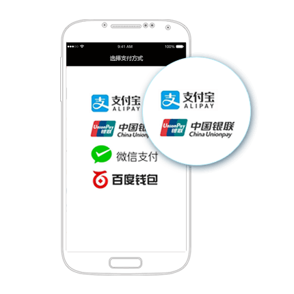 域擎收银台,为iOS/Android原生/H5 App提供支付解决方案:支持微信支付、支付宝支付、银联手机支付、百度钱包等。
